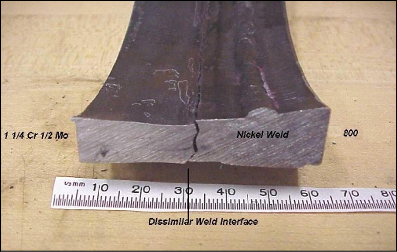 Dissimilar metal welds (DMWs) are often specified in process plants as an alternative to bolted mechanical joints and have been successfully used in many corrosive and severe services. Common DMWs that can become problematic include joints between ferritic steel (e.g., carbon steel, 1.25Cr-1Mo) and stainless steel (e.g., 304, 2205) or Ni-base alloys (e.g., Alloy 800H, Alloy 625). Other dissimilar metal combinations such as welds between austenitic stainless steels and Ni-base alloys or welds between different grades of carbon and low-alloy ferritic steels present far fewer issues since they do not have such inherent composition or metallurgical phase mismatch. Cladding is another common form of DMW. Large structural steel pressure vessels are often clad with stainless steel to provide a corrosion-resistant layer at lower cost. While advantageous to performance and cost, there can be major weldability challenges with DMWs. This article will provide an overview of common DMW failure mechanisms, discuss challenges with weld repairing DMWs, and offer best practices to ensure successful repairs, in addition to presenting a case study of a DMW failure between Grade 91 (9Cr-1Mo-V) and 800H (20Cr-32Ni).
