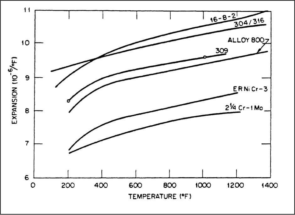 The difference in thermal expansion rates between the two base metals and the weld metal can result in localized stress and strain that will exacerbate cracking mechanisms such as thermal fatigue and creep, particularly at elevated temperatures. The coefficients of thermal expansion of ferritic materials (e.g., steels) and austenitic materials (e.g., 300-series stainless steel and nickel-based alloys) can differ drastically (see Table 1)[2][3].