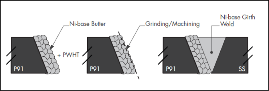 - A two-pass butter layer should be applied to the P91 weld groove to help accommodate thermal contraction stress during welding.