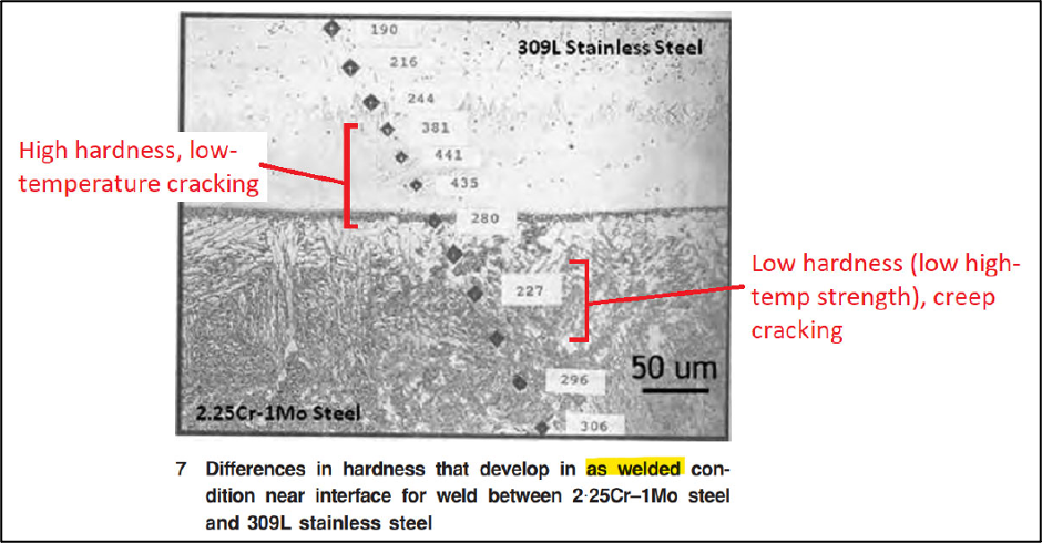 Several failure mechanisms are associated with DMWs due to the inherent differences in chemical composition, mechanical and physical properties, and corrosion resistance between the base metals. At a baseline, all DMWs are subject to dilution. Similarly, in DMWs between a ferritic base metal and austenitic weld metal (especially one with more chromium alloying), carbon migration/diffusion across the interface may occur during exposure to elevated temperatures. The resulting composition transition region between the bulk weld metal and base metal may have a distinctly different microstructure and properties than the adjacent regions. Transition zones as shown in Figure 1 may be created in DMWs such as in welds between stainless steels and low-alloy steels where martensite may form in the transition region even though it does not occur elsewhere in the weld[2]. In a hydrogen-charging environment (e.g., wet H2S), this hard zone can lead to premature cracking. Almost universally, the problems encountered are on the ferritic side of dissimilar welds joining ferritic to austenitic (stainless steel or Ni alloy) made with austenitic (stainless steel or Ni) fillers, as opposed to on the austenitic side.